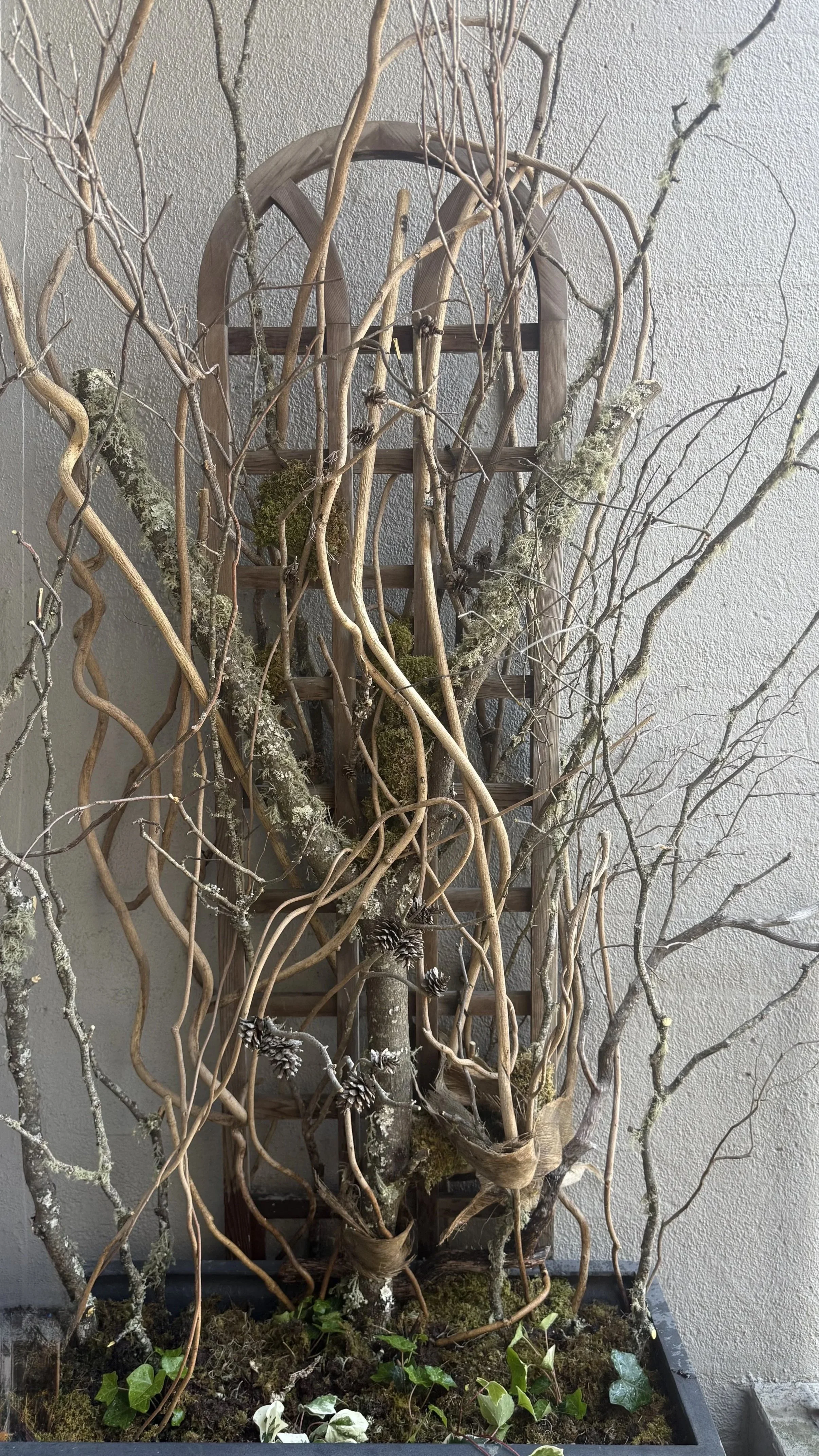 This month, I’ve been working on an outdoor floral sculpture for a client’s terrace, an exposed, windy space with very little sunlight. The intention has been to create something grounded and enduring, using wisteria branches, moss-covered limbs, and preserved moss from my previous installation.